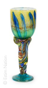 Haut verre à jambe en verre soufflé et filé, le godet à décor bleu sur fond jaune et vert, la jambe polychrome terminée par un pied circulaire.