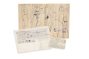 BAYER KONRAD (1932-1964). Écrivain autrichien, membre du Wiener Gruppe. DESSIN original, avec notes autographes et croquis au verso; 21 x 29,5 cm.; en allemand. Dessin au stylo bille bleu, représentant huit silhouettes féminines, diversement...