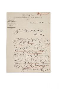 BENZ CARL (1844-1929). Ingénieur allemand, pionnier de l'automobile. L.S. «Benz & Cie», Mannheim 21 novembre 1896, à Max WOLF à Heidelberg; 1 page in-4 à en-tête Benz & Co. Rheinische Gasmotoren-Fabrik, Mannheim (petits trous dans le coin sup....