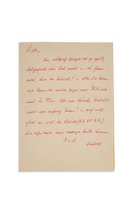 BRECHT BERTOLT (1898-1956) Poète et auteur dramatique allemand. L.A.S. «Bertolt», [à Ruth BERLAU]; 1 page petit in-4 au stylo bille rouge; en allemand. À son amie et collaboratrice Ruth BERLAU (1906-1974, actrice et écrivain danoise; elle fut...