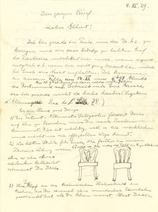 Il loge à la Légation d'Allemagne. Puis il aborde trois sujets, en paragraphes numérotés: 1) il lui donne des conseils sur le travail de Hans Albert sur un brevet; 2) il lui off re des chaises qui se trouvaient dans l'appartement de Zurich (avec 2 dessins de ces chaises, le premier biff é); 3) il transmet une invitation du professeur Ludwig Hopf de la «technischen Hochschule in Aachen» (Aix-la-Chapelle), qui avait donné à Hans Albert un merveilleux chemin de fer quand il était petit («eine wunderbar Eisenbahn geschenkt hat, als Du klein warst»), cela pourrait être une excursion dans son véhicule infernal («dein Teufels-Fahrzeug»). Il doit maintenant monter sur un trapèze et donner une conférence en français sur sa nouvelle théorie à l'Institut Poincaré. Ce sera une rude épreuve. Et il a encore presque une semaine de ce genre devant lui ! («Jetzt muss ich dann gleich aufs Trapez und im Inst. Poincaré über meine neue Theorie französische vortragen. Es wird eine infernalische Strapaze sein. Und ich habe fast eine Woche solcher Art vomir !») Au moins, habiter la Légation le rend plus difficile à atteindre...