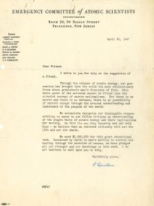 Soutenus par la foi en la capacité de l'homme à contrôler son destin par l'exercice de la raison, ils ont engagé toute leur force et leur savoir dans ce travail. Einstein fait appel à son correspondant pour les aider... «Through the release of atomic energy, our generation has brought into the world the most revolutionary force since prehistoric man's discovery of fire. This basic power of the universe cannot be fitted into the outmoded concept of narrow nationalisms. For there is no secret and there is no defense; there is no possibility of control except through the aroused understanding and insistence of the peoples of the world. We scientists recognize our inescapable responsibility to carry to our fellow citizens an understanding of the simple facts of atomic energy and their implications for society. In this lie our only security and our only hope - we believe that an informed citizenry will act for life and not for death»...