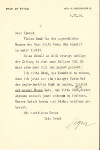 FREUD SIGMUND (1856-1939) L.S. «Sigm», Wien 4 juin 1924, à son neveu Edward; 1 page in-8 dactylographiée à son en-tête Prof. Dr. Freud; en allemand. Il le remercie de l'envoi de numéros des Bnai Brith News, mis dans ses archives. Puis il fait...