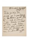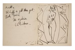 Il a publié des ouvrages importants sur la peinture allemande, ainsi que plusieurs monographies d'artistes.] Il aimerait beaucoup faire quelques croquis pour ses tissages. Il demande qu'elle lui indique le format, et surtout la largeur que cela peut atteindre. Il vient de préparer avec Heckel l'affiche pour la nouvelle exposition... «Ich hätte gern ein paar Entwürfe für Ihre Webereien gemacht. Wollen Sie mir bitte das Format angeben. Besonders wie breit die Sachen werden können. Ich habe jetzt mit Heckel zusammen das Plakat für die neue Kunstausstellung gemacht”... Sur la troisième page, à pleine page (20 x 16,5 cm), il a fait un dessin à la plume représentant une femme nue dans un ovale entouré d'ornements.