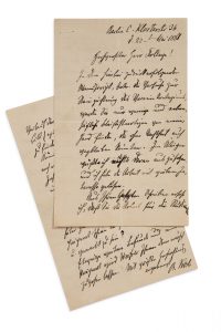 Il rapporte et commente longuement les résultats de l'examen de cette masse... Il demande des détails sur l'infection constatée par son collègue, sur son historique, son type; est-ce que la blessure est arrivée jusqu'à l'articulation ? comment est-il arrivé qu'une affection du larynx soit le symptôme suivant ? Le pouce est-il coupé du corps ?... Weisser enverra bientôt d'autres résultats et une préparation... «Aus Ihrem [...] Schreiben ersehe ich, daß Sie die Arbeit für die Studirenden bestimmt haben, als Ergänzung für Ihr Werk über die Vaccination, wie ich mir denke. In Bezug hierauf möchte ich jedoch meinen, daß für die Studirenden ein ganz kurzer Auszug über das Vorkommen von Mikroorganismen in der Lymphe und deren muthmaßliche Bedeutung genügte, wenigstens würde ich an die bereits stark überlasteten Studirenden im Examen keine höheren Ansprüche stellen. In ihrer jetzigen Form scheint mir die Arbeit sich besser zur Veröff entlichung als Brochure oder in einer Zeitschrift zu eignen [...] In Bezug auf die Vaccine-Parasiten habe ich an Ihren gütigst hiergelassenen Präparaten noch zu keinem Resultat kommen können. Ich habe zwar manche von den in Ihren Abbildungen vertretenen Formen gesehen, konnte mich aber noch nicht davon überzeugen, daß es selbstständige Gebilde seien. Möglicherweise liegt dies daran, daß ich mich der Untersuchung nicht mit ungetheilter Aufmerksamkeit widmen konnte. C. Fraenkel beabsichtigt, sich mit dem Studium der Vaccine zu beschäftigen und da habe ich ihm das von Ihnen erhaltene Vaccine-Material übergeben, um es für seine Untersuchungen zu verwerthen. Auch die beiden Kästchen mit den hohlen Objektträgern habe ich ihm gegeben und anempfohlen, die Präparate ebenfalls noch einmal genau durchzusehen. Er wird mir alles Bemerkenswerthe zeigen und so hoff e ich noch allmälig alle Stadien des Parasiten zu Gesichte zu bekommen [...] Die Untersuchung des Daumens hat einige Schwierigkeiten bereitet und das ist auch der Grund dafür, daß mein Schreiben sich etwas verspätet hat. Ich hatte nämlich Dr Weisser, den ich mit der Untersuchung beauftragte, gebeten, den Zusammenhang der Theile möglichst zu schonen. Nun waren aber die oberfl ächlichen Hautpartien nicht besonders gut gehärtet, so daß es Weisser nicht gelang, gute Schnitte zu bekommen und in dem, was er erhielt, fand sich nichts von Riesenzellen oder Tuberkelbacillen. Ich entschloß mich dann, den Daumen weiter zu zerlegen und fand, daß das Gelenk mit einer bröcklichen weißen Masse, off enbar die Reste von käsigem durch die Alkoholwirkung geschrumpften Eiter gefüllt war; die Gelenkenden vom Knorpel entblößt, rauh; die Gelenkhöhle von einer weichen ziemlich dicken Membran ausgekleidet, der die bröckliche Masse zum größten Theil anhaftete. Diese Masse ließ ich zunächst untersuchen und es fanden sich in derselben Tuberkelbacillen in solcher Menge, wie ich es in Gelenken noch nie gesehen habe. Der Befund und das ganze Aussehen der kuriosen Gelenkhöhle erinnerte vielmehr an eine frische Lungenkaverne mit ihrem käsigen, bacillenreichen Inhalt. Es soll nun noch die Membran und die weitre Umgebung des Gelenks noch einmal gründlich untersucht werden, ob nicht doch irgend wo ein mehr dem chronischen Verlauf der Bacilleninfection entsprechendes Bild (epithelcoide und Riesenzellen in Nestern) zu fi nden [ist]. Könnten Sie nicht die Geschichte dieser Infektion noch etwas eingehender geben: Art der Infection? gieng die Verletzung gleich bis ins Gelenk? wie kam es, daß eine Kehlkopfsaff ektion das nächste Symptom war? Ist der Daumen von der Leiche abgeschnitten? Kam bei Lebzeiten aus dem Gelenk kein Eiter zum Vorschein? an dem Spirituspräparat schien die Infektionsstelle geschlossen u. vernarbt zu sein? Etwaige weitere Befunde und ein Präparat wird Weisser Ihnen demnächst zugehen lassen»...