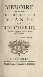 [BOUCHERIE]. Mémoire concernant le commerce de la viande de boucherie, par un magistrat du Parlement de Dauphiné. Grenoble, Faure, s.d (1770). In-12, demi-veau fauve, dos lisse très orné de fleurons et palettes dorées, pièce de maroquin rouge...