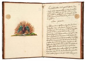 Manuscrit du XVIIIe siècle, orné de 2 dessins originaux aquarellés : le premier, figuré en face du titre, est un flacon renfermant l'essence des végétaux, des animaux et des minéraux; le second représente un phénix triomphant dans les flammes.