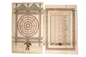 Le texte donne les prévisions du temps qu'il fera, avec les conseils qui en résultent pour les achats de vins et autres denrées, bétail, etc. Il est accompagné de 2 planches manuscrites avec les bords repliés, l'une représentant dans un décor architectural les roues des mois, des signes astrologiques, des planètes, des jours et des saisons, l'autre un tableau aidant à la divination (Almanach à cognoître l'année où tu seras).