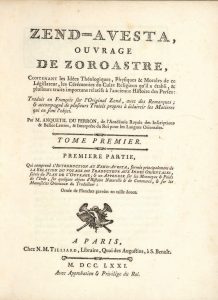 Important ouvrage pour la connaissance du zoroastrisme, religion monothéiste initiée par Zarathoustra (Zoroastre en grec), traduit et publié par Anquetil du Perron, académicien célèbre versé dans les langues orientales.