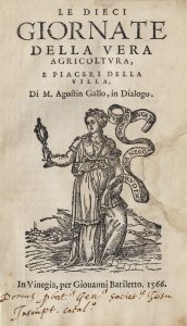 GALLO (Agostino). Le Dieci Giornate della vera Agricoltura e piaceri della Villa... in dialogo. In Viegia , per Giovanni Bariletto, 1566. Petit in-8 carré, relié vélin, tranches teintées (8 f. non chiffrés – 208 f. – 8 f. non chiffrés de...