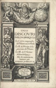 Trois discours philosophiques. Le I de la comparaison de l'Homme avec le Monde. Le II du Principe de la génération de l'Homme. Le III de l'Humeur Melancholique. Évreux, Antoine Le Marié, 1603. In-8, vélin à recouvrement, titre manuscrit au dos (Reliure de l'époque).