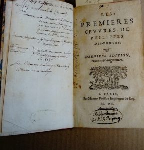 DESPORTES (Philippe) — Les premières œuvres de Philippes Des-Portes. dernière édition revue & aug. – Paris, Mamert Patisson, 1600 – [8], 338, [6] f. – reliure postérieure veau XVIIIe, dos lisse orné, p. de t. rouge.