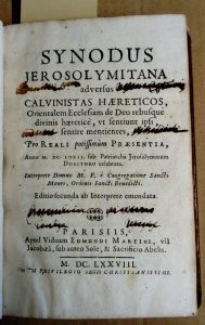 [ ] SYNODUS Jerosolymitana adversus Calvinistas haereticos orientalem ecclesiam de Deo resque divinis haeretice, ut sentiunt ipsi, sentire mentientes, pro Reali potissimum praesentia, anno MDCLXXII ed. secunda – Paris, veuve d'Edmond Martin, 1678...