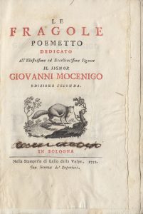 ROBERTI (Conte Giovanni Battista). La Fragole, Poemetto dedicato all’ illustrissimo ed Eccelentissimo Signore Giovanni Mocenigo. Edizione seconda. In Bologna, nelle Stamperia di Lelio della Volpe, 1752. Petit in-8, cartonnage de papier bulle...