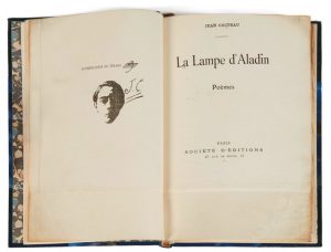 Édition originale du premier recueil de Cocteau, publié à compte d'auteur, un des 50 exemplaires numérotés sur Hollande (n° 9), justifié et signé «J. C» par Cocteau à côté de la vignette de son portrait.