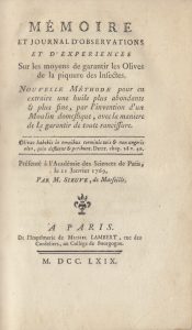 SIEUVE (Lazare). Mémoire et journal d’observations et d’expériences sur les moyens de garantir les olives de la piqure des insectes ; nouvelle méthode pour en extraire une huile plus abondante et plus fine, par l’invention d’un moulin...