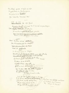 L'ensemble comprend les manuscrits suivants: * l'épigraphe (1 p.), plus développée que dans l'édition: «Traduit de quoi ? De cette langue morte, de ce pays où mes amis sont morts. Quelquefois le traducteur a plus de chance. Il retrouve des rythmes, des rimes. Quelquefois il se contente de traduire fidèlement.