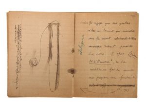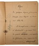 (22 x 17 cm), à l'encre noire sur papier ligné, dans un cahier d'écolier avec sa couverture d'origine en partie autographe (feuillets désolidarisés de la couverture, agrafes métalliques au centre rouillées).