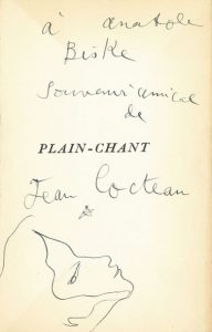 Envoi autographe signé avec dessin, au futur poète Alain BOSQUET, sur le faux-titre: «à Anatole Biske Souvenir amical de Jean Cocteau», avec profil d'une tête de jeune homme à la plume, en bas de page.