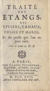 TRAITÉ DES ÉTANGS, des viviers, canaux, fosses et mares, et du profit que l’on peut en tirer. Par le frère L.D.B. Paris, Claude Prudhomme, 1717. Petit in-12, veau granité, dos à nerfs, fleurons dorés. 7 f. non chiffrés, 120p. et 4 feuillets.