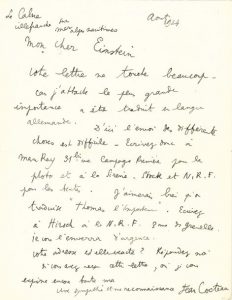 L.A.S. «Jean Cocteau», Villefranche-sur-Mer août 1924, à Carl EINSTEIN; 1 page in-4.