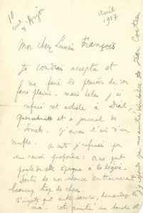 Au journaliste de mode, écrivain et dramaturge d'origine belge Lucien FRANÇOIS (1904-1963): «Je voudrais accepter et me faire le plaisir de vous faire plaisir, mais hélas j'ai refusé cet article à Dial, Querschnitt et au journal des Soviets. J'aurais l'air d'un mufle. Au reste je refusais pour une raison profonde: on ne peut parler de cette époque à la légère. Sortir de son silence entrainerait beaucoup trop de choses»...