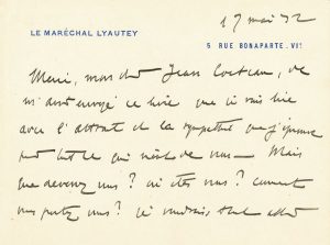 L.A.S. «Lyautey», Paris 17 mai 1932, à Jean COCTEAU; 2 pages oblong in-12 à son en-tête.
