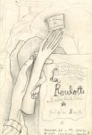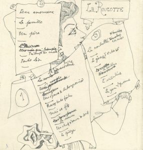 La page suivante (32,3 x 21,6 cm) semble un projet d'affiche, à la plume et au crayon noir, ornée d'un beau dessin très élaboré à pleine page: la main de Cocteau, sur les draps et couverture d'un lit défait, tient une main postiche brandissant un petit carton d'annonce; dans un grand cartouche, le titre:«La Roulotte ou La maison dans la lune * pièce en 3 actes», et au-dessus la dédicace aux interprètes envisagés: «à Yvonne de Bray à Madeleine Ozeray à Gabrielle Dorziat à Louis
