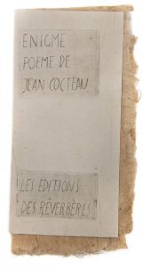 Enigme. Poème de Jean Cocteau ([Paris], Les Éditions des Réverbères, [achevé d'imprimer: 8 mars 1939]); plaquette in-8 (198 x 105 mm) de 16 ff. n. ch., brochée, non coupée, non ébarbée, sous jaquette gravée sur papier de Chine rempliée.