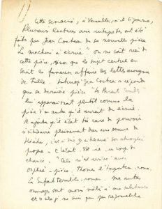Il s'agit d'une interview fictive: «Cette semaine, à Versailles, où il séjourne, plusieurs lectures ont été faites par Jean Cocteau de sa nouvelle pièce La Machine à écrire. On ne sait rien de cette pièce, sinon que le sujet central en serait la fameuse affaire des lettres anonymes de Tulle. Interrogé, Jean Cocteau a répondu que sa dernière pièce Les Parents terribles lui apparaissait plutôt comme la pièce d'un autre qu'il aurait dû écrire. II ajouta qu'il était très rare de pouvoir s'introduire pleinement dans une oeuvre de théâtre, c'est-àdire y introduire son atmosphère propre». Puis il prend directement la parole: «Cela m'est arrivé avec Orphée, pièce - Thomas l'imposteur, roman - Les Enfants terribles, roman. Mes autres ouvrages sont moins mêlés à ma substance et de cela je ne suis que peu responsable. Car, pour écrire je tâche de me mettre dans un état d'irresponsabilité qui me laisse peu de contrôle. Je crois, en effet, que la fameuse “écriture automatique” ne provoque pas seulement des résultats de rêve et de bizarrerie. Toute oeuvre, digne de ce nom, est en quelque sorte de l'écriture automatique. [...] Cet état d'irresponsabilité, de sommeil éveillé, ressemble (de loin) au sommeil du Protoxyde d'azote chez le dentiste. On se trouve précipité dans une vitesse immobile inconnue, dans une sorte de crescendo de nuances mystérieuses. Au réveil on se souvient de cet état mais d'aucun autre détail. Il en va de même pour l'état d'écriture. Je ne saurais pas raconter, ensuite, pourquoi les répliques et les intrigues s'enchaînent. Cela relève du psychiatre.