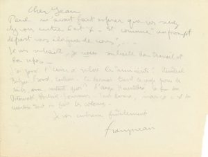 «Cher Jean Paul m'avait fait espérer que vous seriez chez vous entre 6 et 7. Et comme “un prompt départ vous éloigne de nous”.... je vous souhaite, je nous souhaite bon travail et bon repos. J'ai passé l'hiver à relire les “amis écrits” - Stendhal, Balzac, Proust, Cocteau.