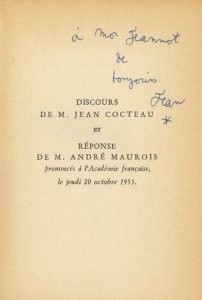 Envoi autographe signé à Jean Marais, au stylo bille bleu sur la page de faux-titre: «à mon Jeannot de toujours Jean».