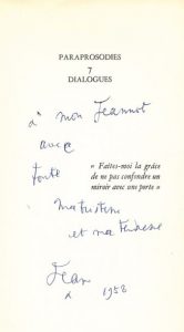 Envoi autographe signé à Jean MARAIS, au stylo bille bleu sur le faux-titre: «à mon Jeannot avec toute ma tristesse et ma tendresse
