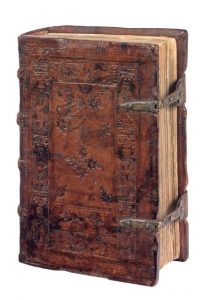 TRÈS ÉLÉGANTE RELIURE D’ALLEMAGNE DU SUD en veau brun sur ais de bois, encadrement d’une roulette aux motifs Spes, Fides et Fortit[udo], due à un atelier très proche du Relieur de Johann Jakob Fugger ou d’Heinrich Peisenberg (nommé en 1572 Hofbuchbinder à Munich pour le comte Albrecht Von Bayern), ou encore du relieur d’Augsbourg Caspar Horneffer.