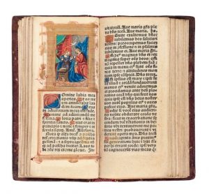 Hore beate Marie virginis secundum usum romanum totaliter ad longum sine requirens. Cum multis suffragiis et orationibus de novo additis. Noviter impressis Parisius per Germanum Hardouyn. Commorantes inter duas portas Palatii ad intersignium dive Margarete. Paris, “nouvellement imprimees par Germain Hardouyn, marchant libraire et imprimeur, demourant audit lieu entre les deux portes de palays a l’enseigne Saincte Marguerite » (colophon), s. d. [vers 1529, calendrier pour 1529-1545]. In-24 (106 x 50 mm), [90] ff. (A-P6), justification 820 x 35 mm, 32 lignes. Maroquin rouge à décor doré (semé de fleurettes dans un treillage), dos à 3 nerfs, tranches dorées (Reliure du XVIIIe siècle). EXCEPTIONNEL ET RAVISSANT LIVRE D’HEURES DE TRÈS PETIT FORMAT, IMPRIMÉ SUR VÉLIN en caractères gothiques et ENLUMINÉ, dans une charmante reliure du XVIIIe siècle.
