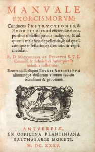 Manuale exorcismorum. Anvers, ex Officina Plantiniana, B. Moretus, 1635. In-8 (154 x 97 mm), vélin souple (Reliure de l'époque). "Curieux manuel d'exorcismes contre les fièvres, la peste et autres infirmités naturelles, contre les philtres d'amour, les sorts jetés aux aliments, les maléfices du démon dans le mariage, les incubes et les succubes, les mauvais esprits qui infestent les maisons..." (Dorbon, 1565 ; éd. 1648). Caillet, 3746.