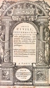 Advis civils contenans plusieurs beaux et utils enseignemens, tant pour la vie politique, que pour les conseils, et gouvernemens des Estats & Republiques. Paris, pour Abel l'Angelier, 1584. In-8 (169 x 99 mm), veau olive, dos à nerfs orné de fleurons dorés, décor à la Duseuil sur les plats (Relié vers 1860). Première édition française. Beau titre dans un portique.