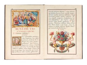 - SEPT PEINTURES D’UN TIERS DE PAGE (c 110 x 160 mm) dans un cadre rocaille doré, avec des scènes de la Vie du Christ, en tête des principales prières (Exorcisme p.1 ; Benedictio candelabrum p. 6, Bénédiction des Cendres p. 8, Rameaux p. 10 (magnifique entrée triomphale à Jérusalem), Benedictio Ignis p. 13, In solemnitate Corpus Christi p. 14 (la Cène), Orationes diversae (pro Papa, pro Imperatore, pro Rege vel Duce… Tempore Terremotus, etc. ) p. 18 : la Vierge et les apôtres à la Pentecôte.