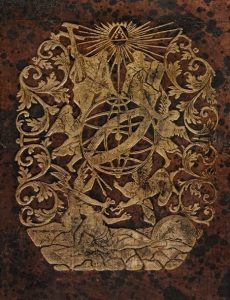 LUXUEUSE RELIURE À DÉCOR PARLANT, SPÉCIALEMENT DESTINÉE À L’ÉDITION, par l’Atelier à la double poignée de tiroir (Double Drawer Handle Bindery) identifié par Jan Storm van Leeuwen. Ce relieur invente pour le grand éditeur Lindenberg et ses éditions en français et en hollandais de la Bible des reliures en veau avec une marbrure spéciale (« Tortoise shell »), et le spectaculaire motif de la grande plaque : un homme enchaîné à un globe, menacé par un diable muni de flèches tandis qu’un ange lui offre les clefs du Paradis ; deux anges portent un globe céleste avec Moïse et Jésus, symboles de l’Ancien et du Nouveau Testament, éclairés par la lumière de la Trinité.