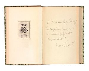 Du côté de chez Swann. Paris, Bernard Grasset, 1914. In-12 (174 x 110 mm), demi-toile bise, plats de papier décoré, couverture conservée. Édition originale, couverture à la date de 1913 (initiales BG au plat inférieur de la couverture), état intermédiaire avec mention fictive de Troisième édition. « Les exemplaires de cet état intermédiaire sont très rares. Le seul que nous connaissons appartient à M. Edouard Loewy, qui a eu l’amabilité de nous le communiquer » (Max Brun, Contribution à l’étude des premiers tirages de l’édition originale de « Du côté de chez Swann », 1936, p. 16).