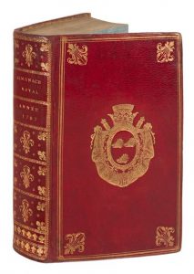 année 1787. Paris, Debure, 1787. Grand in-8, maroquin rouge, filets dorés et grosse fleur de lis aux angles, armoiries au centre, dos lisse orné de fleurs de lis, doublure et gardes de soie bleue, dentelle intérieure, tranches dorées (Reliure de l'époque). Exemplaire sur grand papier bleuté relié en maroquin rouge aux armes d'Armand de Miromesnil (1723-1796), garde des Sceaux de Louis XVI après avoir été maître des cérémonies de l’ordre du Saint-Esprit.