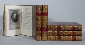 Œuvres complettes. Avec des avertissemens et des remarques sur chaque pièce, par M. G*** [Garnier]. Nouvelle édition. Paris, de l'imprimerie de Monsieur, chez la veuve Duchesne et fils, 1790. 6 volumes in-8, basane porphyre, torsade dorée, dos lisse orné, roulette sur les coupes, torsade intérieure dorée, tranches jonquille mouchetées (Reliure de l'époque). Premier tirage de cette belle illustration comprenant un portrait de l'auteur gravé par P.-A. Tardieu d'après Rigaud et onze figures hors texte par Moreau le Jeune et Marillier.
