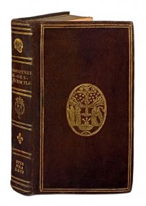 Le Promptuaire des exemples des vertus et vices, recueilli de l'ancien & nouveau Testament. Anvers, Jean Bellère, 1569. In-8, maroquin souple brun, double filet, médaillon ovale au centre comprenant une Crucifixion dorée, dos lisse orné d'armoiries, de la devise « Spes mea Deus », d'une tête de mort et d'une fleur de lis, tranches dorées (Reliure de l'époque). Édition originale de la première traduction française, donnée par Antoine Tiron, de cet ouvrage connu sous le nom de Biblia pauperum, composé par le dominicain Nicolas de Hanapes (1225-1291), patriarche de Jérusalem. L'édition princeps, publiée à Venise en 1477, l'attribuait à tort à saint Bonaventure.