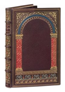 Les Débuts de César Borgia. Paris, Société des Bibliophiles contemporains, 1890. Grand in-12, maroquin prune, important décor à la cathédrale doré et mosaïqué de maroquin bleu, citron, rouge et vert, dos orné de fers romantiques dorés et mosaïqués de maroquin rouge, doublure de maroquin prune ornée d'une plaque dorée à la Du Seuil, gardes de soie prune et rouge, doubles gardes, filets sur les coupes, tranches dorées, couverture et dos, étui (Visinand). Édition illustrée de 13 compositions de Georges Rochegrosse gravées à l'eau-forte par Paul Avril, F. Courboin, Fornet et Manesse, coloriées à la main et rehaussées d'or.