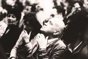 ATWOOD (Jane Evelyn). Portrait photographique de Genet [vers 1976]. Tirage argentique (238 x 178 mm) ; cachet de la photographe au verso. Superbe portrait de Jean Genet en train de fumer dans la foule du meeting demandant la libération des Dix de Wilmington.