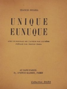 Unique eunuque. Paris, Au Sans Pareil, 1920. Grand in-12, broché, à toutes marges. Édition originale, avec un « portrait de l'auteur par lui-même » et une préface de Tristan Tzara.