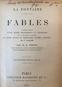 Nombreuses passages marqués en marge au crayon rouge, ou soulignés à la mine de plomb. - Montherlant a également fait quelques annotations, comme à la suite de la fable « Le torrent et la rivière » cette citation « Il n’est pire eau que l’eau qui dort » - (Proverbe) — la garde volante inférieure est entièrement annotée. - Quelques caricatures à l’encre (dans la marge de la p. 400) et sur le contreplat inférieur. Reliure usée, cahiers déboités, quelques feuillets portent des traces d’adhésif. De toute évidence ce petit volume a été beaucoup lu. Emouvante relique ayant appartenu à Henry de Montherlant.