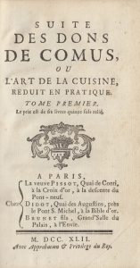 Édition originale très rare d'un des ouvrages les plus importants du règne de Louis XV. Il suffit de lire cet ouvrage et de lire « Les Dons de Comus » volume publié 3 ans plus tôt pour constater, contrairement à ce qui a été dit et écrit jusqu’à lors, que cet ouvrage en 3 volumes n’est pas du tout une réédition du petit volume précédent, publié chez la veuve Pissot. La boutique de Prault fils est située juste en face de la sienne et il est impossible que la veuve ait ignorée la production des 3 volumes. Cependant, et toujours contrairement aux dires de bibliographes et libraires, le frontispice a été regravé d’après celui de Le Bas (un personnage central a été ajouté au premier plan, offrant des légumes) ; l’éditeur n’a donc pas pu se procurer l’ancien tirage de la 1ère planche. On a seulement attribué « gratuitement» les deux ouvrages à F. Marin, lequel aurait été maître d’hôtel du Prince Charles de Rohan-Soubise (l’ami de cour du roi). La préface est attribuée à Meusnier de Querlon, l’auteur des « Soupers de Daphné... ». Dans la préface du présent ouvrage (p. XLIX) est inscrit : « L’ouvrage que je donne aujourd’hui est exactement la suite des « Dons de Comus » ». Le premier volume concerne : les bouillons, consommés, sauces, coulis, les potages et viandes ; le 2ème volume concerne le cochon, les volailles, le gibier, les légumes et champignons ; le 3ème volume concerne les pâtés, pâtisseries, rôtis, beignets, canapés, œufs, bouillons ; quelques sauces et de nombreux apprêts de poissons de rivière et de mer, et la « Cuisine et économie bourgeoise » . Cet un ouvrage très complet offrant un éventail de plus de 1 500 recettes bien décrites. Très bon exemplaire en condition d’époque. Quelques légères traces claires dues au papier employé et antérieures à l’impression, rendu un peu plus savoureux par 4 marques d’appartenance à la même personne, dont « Ce livre appartient à moy Claude Pierre Mortier de Rive de Gié en Lionnais, bon garçon. Ceux qui le trouveront à lui le renderon, et il leur païra bien gracement leurs peines, fait à Verdun, ce 10 février mil sept cent quarante huit, Claude Pierre Mortier 1748 ». Petites restaurations, très bien faites à la reliure. Marin fut d’abord cuisinier de Madame de Gesvres. Il officia ensuite chez le Maréchal-Prince de Soubise (1715-1787) qui faisait partie des soupers fins de Louis XV en même temps que le Prince de Dombes (1700-1755), qui, sans se dévoiler l’auteur du « Cuisinier Gascon » (1740). On attribue au Prince de Soubise la célèbre sauce aux oignons. Marin décrit « trois sauces particulières aux oignons ».