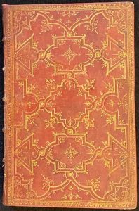 d’un large décor composé de compartiments dessinés par des entrelacs triples, droits et courbes, réservant un encadrement quadrilobé, le tout enrichis de fleurons, aux angles petite tête, coupes filetées, roulette intérieure et tranches dorées, ex-libris. (Relire du XVIIe). Cette reliure « à la petite tête » pourrait donc être de l’atelier de Florimond Badier.