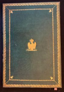 dorée en encadrement des plats avec abeille aux angles, sertis d’une large roulette et de filets dorés, armes impériales au centre, roulette dorée sur les coupes, roulette intérieure et tranches dorées (Reliure de l’époque).